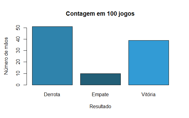Para simplificar a análise, podemos considerar uma simulação de 100 rodadas de Blackjack (utilizando o método de Monte Carlo). Os resultados médios obtidos são: