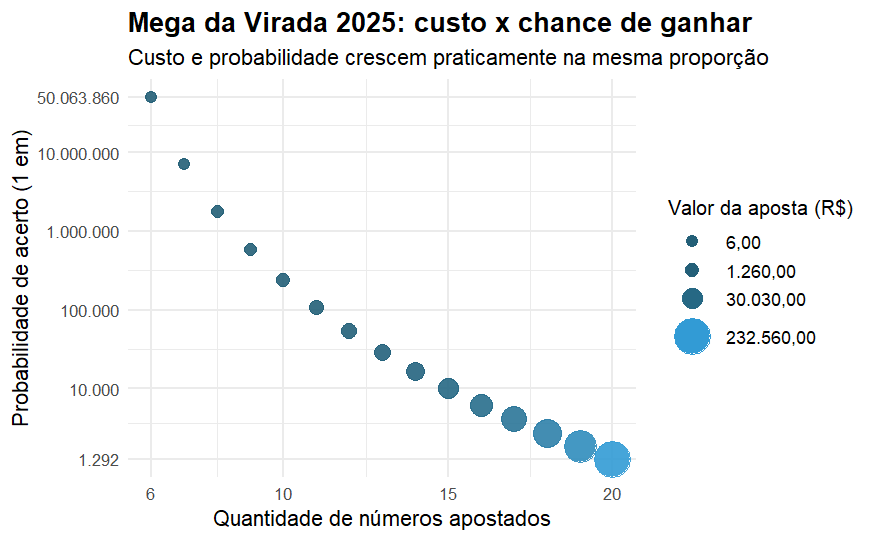 Note que a probabilidade de acerto aumenta à medida que o apostador paga por mais números em sua aposta. No entanto, o valor desembolsado também cresce de forma acelerada, com a aposta máxima de 20 números ultrapassando a marca de 200 mil reais, ainda que proporcione um aumento significativo nas chances de vitória. Assim, embora possa parecer que o apostador está “se dando bem” ao investir mais, a realidade é que as chances permanecem proporcionais ao valor investido, sem oferecer qualquer vantagem estatística desproporcional.