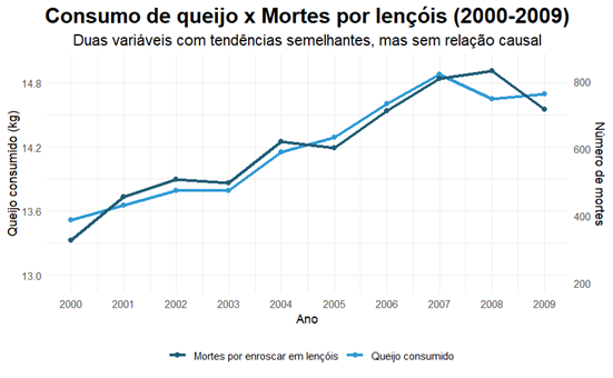 Ao observar as duas séries, é possível notar que ambas apresentam tendências semelhantes ao longo dos anos. De fato, ao calcular a correlação entre as duas variáveis, encontramos um valor de aproximadamente r = 0,95, indicando uma associação estatística muito forte entre elas. Ainda assim, seria absurdo afirmar que o consumo de queijo causa acidentes envolvendo lençóis — ou vice-versa.