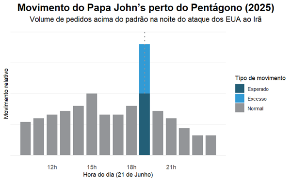 O gráfico a seguir apresenta um exemplo desse tipo de análise, mostrando o movimento esperado de pedidos ao longo do dia em uma pizzaria próxima ao Pentágono e destacando um aumento abrupto de atividade registrado na noite em que foram reportados ataques aéreos dos Estados Unidos contra instalações iranianas: